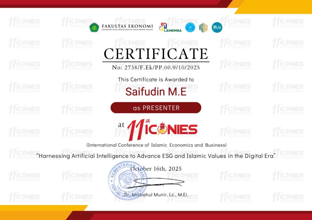 Peran aktif ditunjukkan oleh dosen-dosen dari Program Studi Manajemen Bisnis Syariah (MBS) dalam konferensi internasional ini. Bapak Saifudin M.E, salah satu dosen MBS, turut memberikan kontribusi keilmuan dengan menjadi presenter makalah ilmiah. Kehadiran beliau sebagai presenter menegaskan komitmen Program Studi MBS dalam memajukan riset yang berfokus pada inovasi ekonomi syariah yang berkelanjutan dan berbasis teknologi. Selain itu, Bapak Dr. Qi Mangku Bahjatulloh LC., M.S.I. juga tercatat mengikuti kegiatan ini sebagai partisipan, menunjukkan semangat eksplorasi ilmu dan networking dengan para pakar dari berbagai negara.