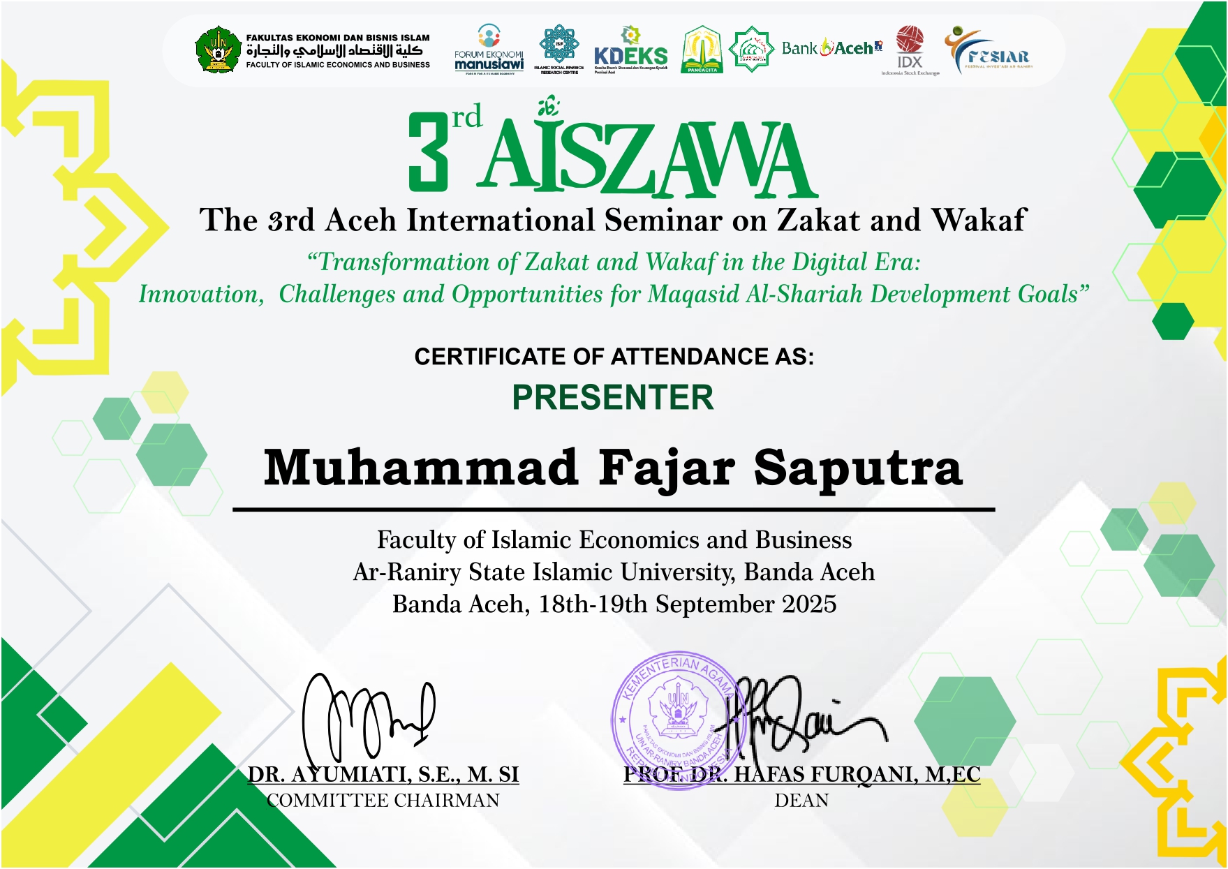 Mahasiswa Program Studi Manajemen Bisnis Syariah (MBS), Muhammad Fajar Saputra, berhasil menjadi salah satu presenter dalam ajang internasional bergengsi The 3rd Aceh International Seminar on Zakat and Wakaf